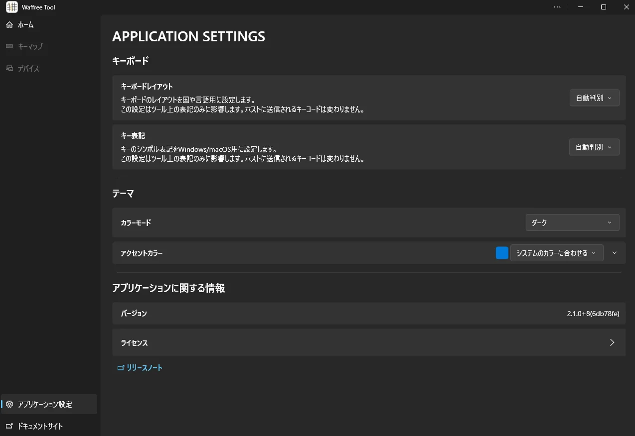 JIS/USレイアウトの切り替えは、接続されたWaffreeに応じて自動判別されます。